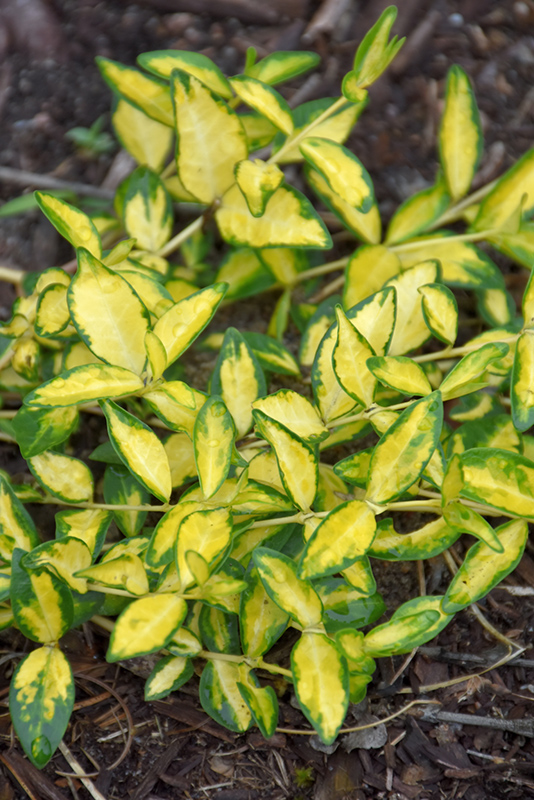 Illumination Periwinkle has masses of beautiful blue flowers along the stems from mid to late spring, which are most effective when planted in groupings. Its attractive small glossy oval leaves remain dark green in color with showy yellow variegation throughout the year.