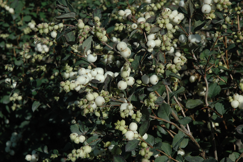 A versatile small shrub valued for its clusters of large white glossy berries that persist into winter along the gracefully arching branches, great for cutflower arrangements, a highly ornamental compact rounded shrub; excellent for mass plantings