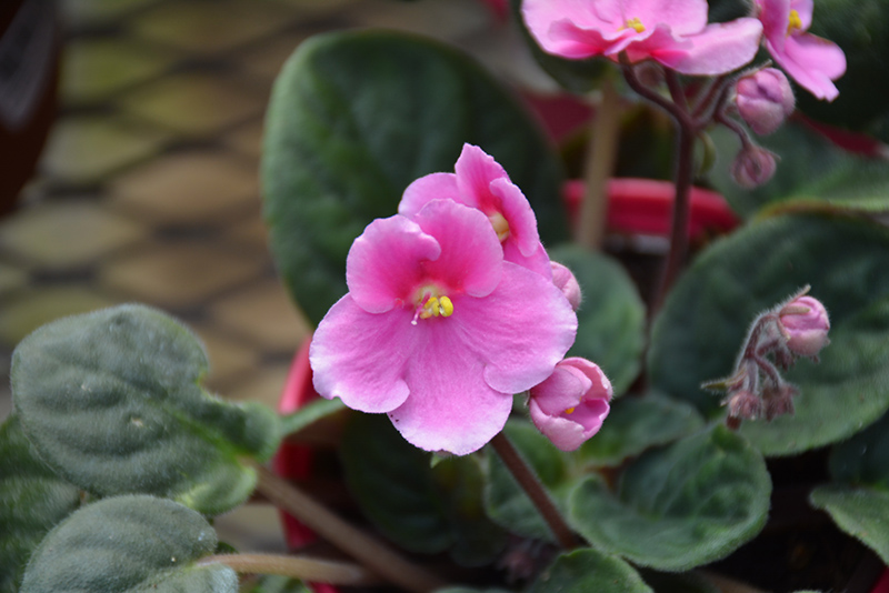 Hybrid Pink African Violet features dainty clusters of pink round flowers with yellow eyes held atop the stems from late winter to late fall. Its tomentose round leaves emerge light green, turning dark green in color throughout the year. The red stems can be quite attractive and add to the plant's interest.