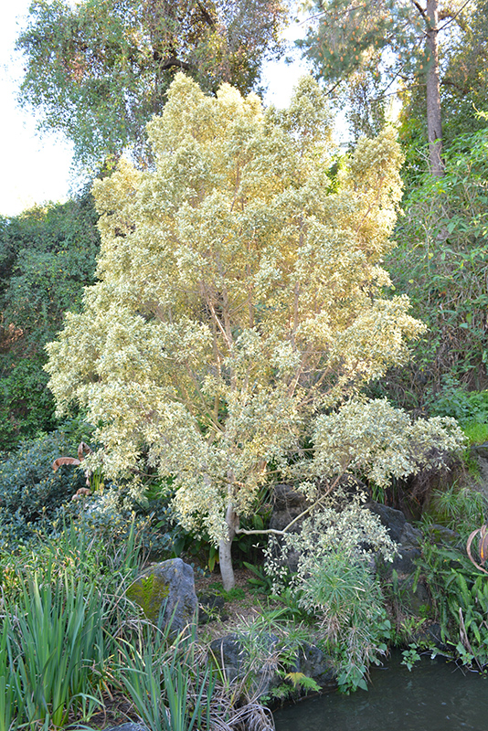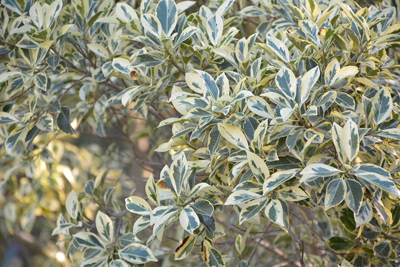 Variegata Weeping Fig's attractive glossy oval leaves remain forest green in color with showy creamy white variegation throughout the year on a plant with an upright spreading habit of growth.