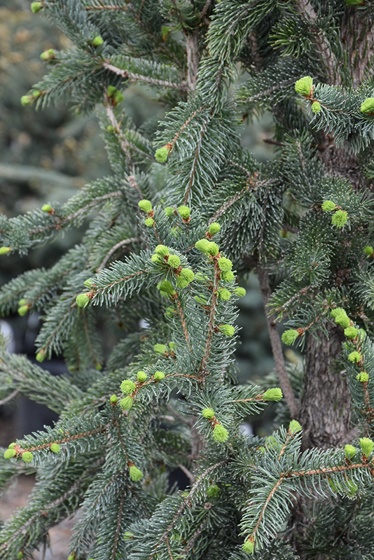 A more columnar selection, which features fine, dark bluish-green needles and a spire-like crown; small dark purple cones turn reddish brown and persist for years; faster growing than the species; site with some wind shelter; tolerates wet sites