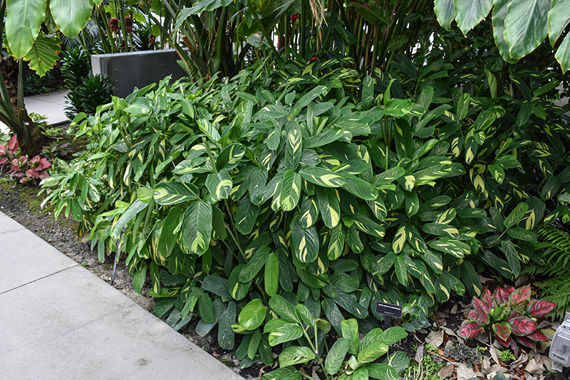 Bamburanta's attractive glossy oval leaves remain dark green in color with showy yellow variegation throughout the year on a plant with an upright spreading habit of growth.