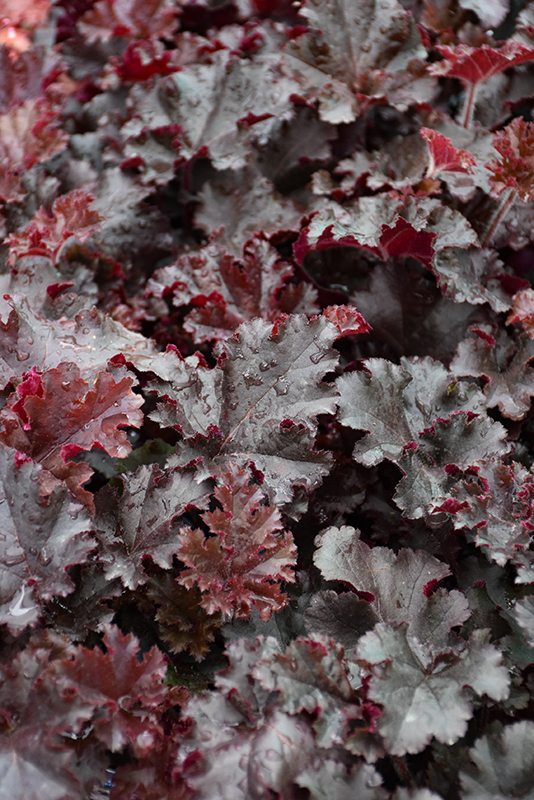 Red bells rise from compact mounds of burgundy foliage with extremely ruffled edges; young leaves are red; amazing contrast to other plants;great versatility; keep soil moist in heat of summer
