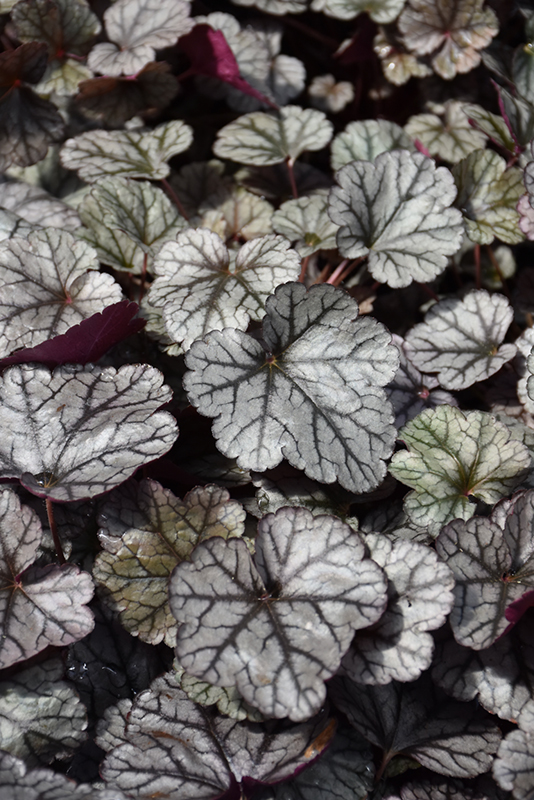Silver Scrolls Coral Bells will grow to be about 15 inches tall at maturity extending to 24 inches tall with the flowers, with a spread of 12 inches. When grown in masses or used as a bedding plant, individual plants should be spaced approximately 10 inches apart. Its foliage tends to remain dense right to the ground, not requiring facer plants in front. It grows at a medium rate, and under ideal conditions can be expected to live for approximately 10 years. As an evegreen perennial, this plant will typically keep its form and foliage year-round.